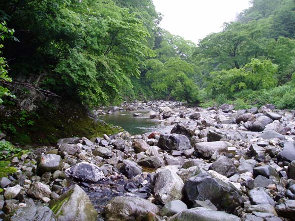 この谷は、落差が少ないために流れは緩く、釣り上がりが楽な場所ですが、