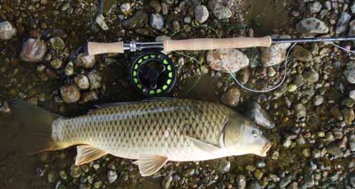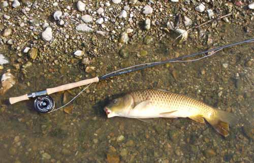 最初の1匹はまだ魚がスレていないため#10のコイ用ドライを使いました。