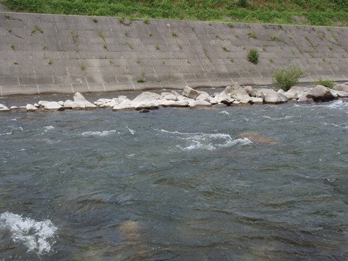 渇水に嘆きつつも、唯一、水量が多そうな瀬を見つけて、さっそく上流側から試してみることに。