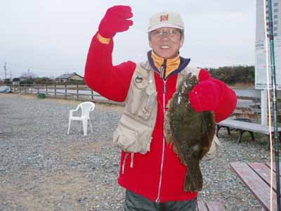 | 豊橋在住の中西様、 ヒラメゲットおめでとう! 他に、ニジマス、サクラマス、イワナ、ブラウンなど、 恐るべしエボレスヤーン、五目釣り達成! 静岡県 浜名湖FR 2008/1/20 |