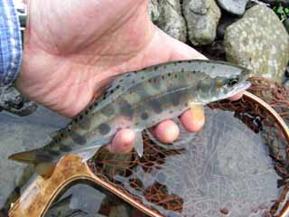 | 今井芳典様、 竿おろしで28cmイワナゲット、おめでとう! 長野県 西野川 2008/07/20 |