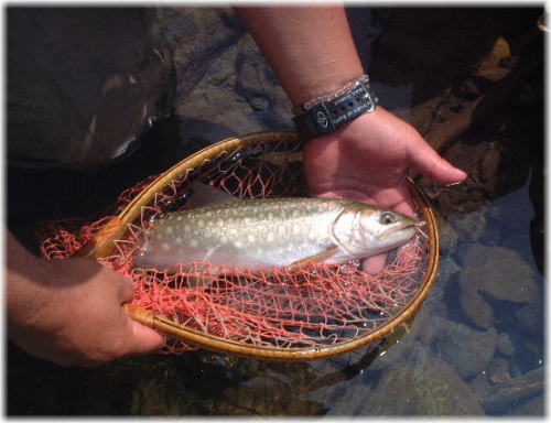 札幌市在住の吉田英生様、37cmのイワナゲット、おめでとう! 北海道といえども、こんな綺麗なイワナはめったに出ないんですよ。 よかったね。 #10スティミュレーター 夕張川 2004/6/27 |