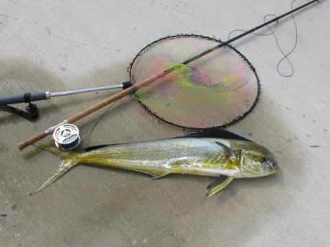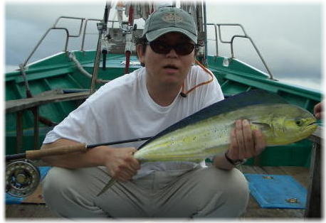 スゲェ! 105cm、メスのシイラです。風来坊様おめでとう!!! 取り込みに30分以上掛かったとのこと。陸ッパリの釣果としては最高でしょう。 #2/0オリジナルセイルフィッシュ 和歌山県由良 2004/6/29 |