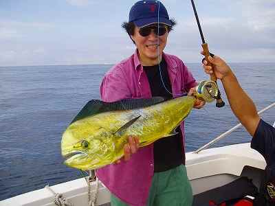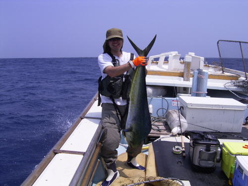 Taichi様、大物シイラのヒットおめでとう! シイラは引きが強くて最高でしょ、また頑張ってね。 和歌山 日の岬沖 2004/08/07 |