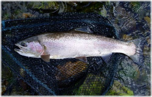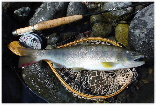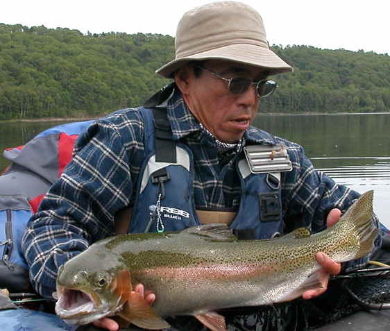 加藤久直様、ヒレピンレインボーのヒット、おめでとう! こんなに綺麗なレインボーはなかなか釣れるものではありません、 良かったね。 忍野 2004/09/04 |