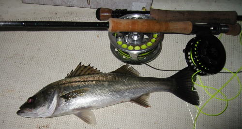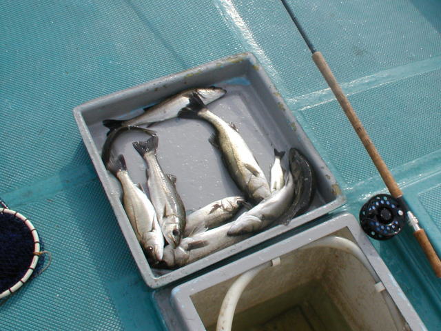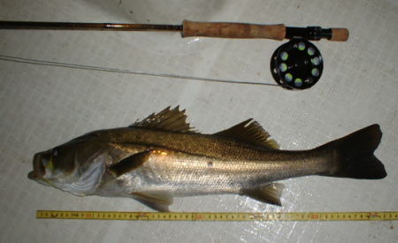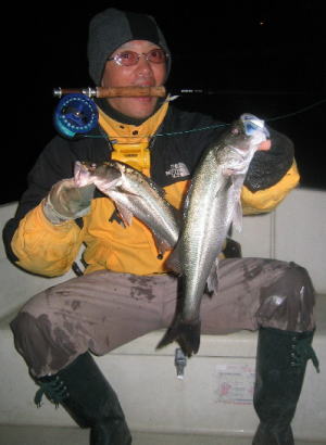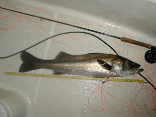 | 風LY坊さん、ビッグサイズおめでとう! シ-バス74cm、フライフィッシングの限界サイズでしょう。 2003/10/18名古屋港 |