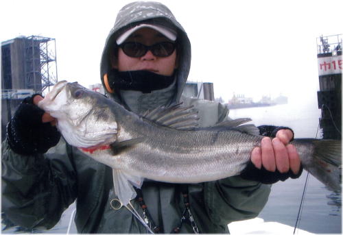 | 平野輝喜様、シーバス57cmおめでとう! 名古屋港のシーバスは、まだまだ釣れてます。 2004/01/17名古屋港 シーバスボートはルーキーズがオススメ、ノウハウがいっぱいあって、 シーバスビギナーの皆さんにも、充分に楽しんでいただけますよ。 |