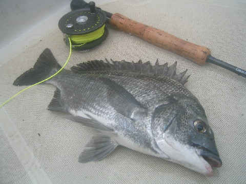 | 静岡県磐田市在住の永田充様、 クロダイゲット、本当におめでとう! パターンは最近話題のイガイフライです。 愛知県 名古屋港 2006/07/20 出船はルーキーズ、クロダイただいま絶好調! |
