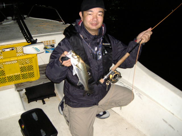 | 斉藤章様、ファーストアタックで大物ヒットおめでとう! シ-バス63cm、他6匹のヒットは上出来です。 2003/11/12名古屋港 |