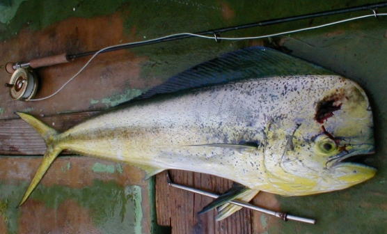 | 番頭カッキーガンバリました。 シイラオス115cm、メスの100cmもゲット、 一日にメーターオーバー2本とは... おぬしなかなかやるわい... 2003/08/02安乗沖 |