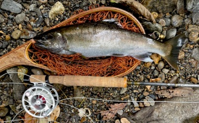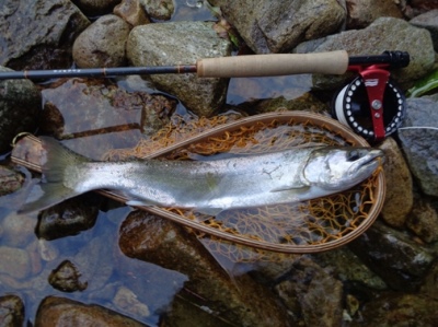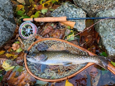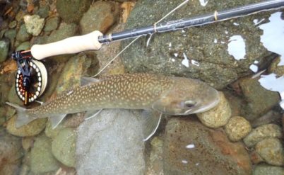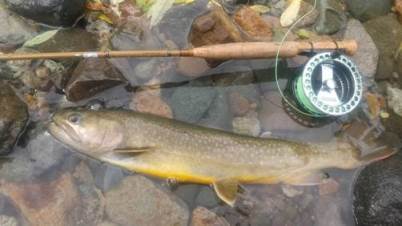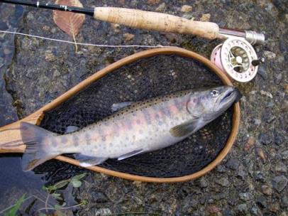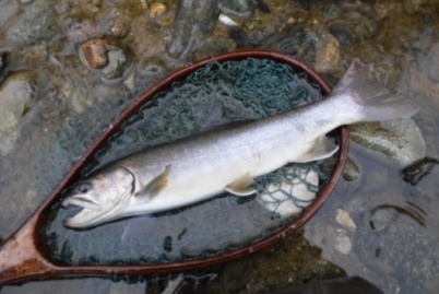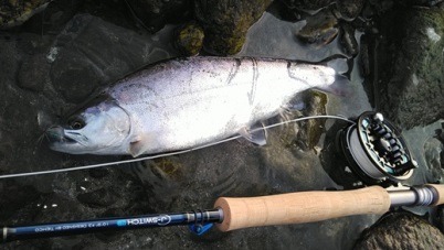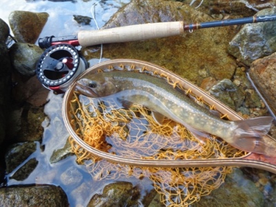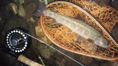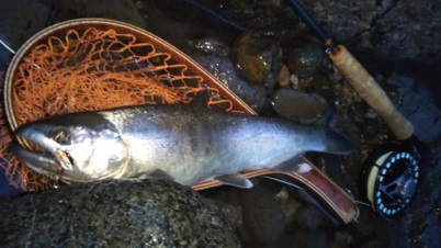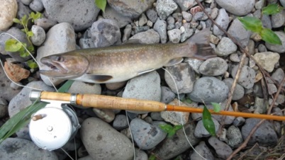 | フィッシャー:福田様 日時:04/10 魚種とサイズ:イワナ35cm 場所;庄川 ヒット フライ:#11マイスターレッド 店主コメント:この季節にしてはとてもいいサイズですね。 おめでとう! |