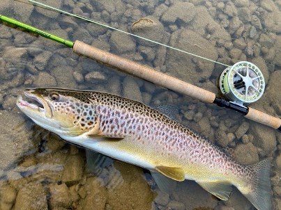 | フィッシャー:岐阜のF様 日時:08/01 釣果:ブラウン63cmゲット 釣り場:庄川本流 店主コメント:素晴らしいサイズですね、天然物はいい顔つき! |