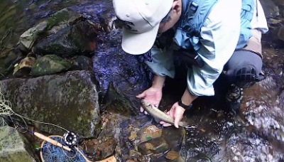 | フィッシャー:若山名人 日時:06/25 釣果:イワナ41cm 釣り場:庄川本流 ヒットフライ:#8グリズリーキング 店主コメント:ウェットの名手、さすが! |