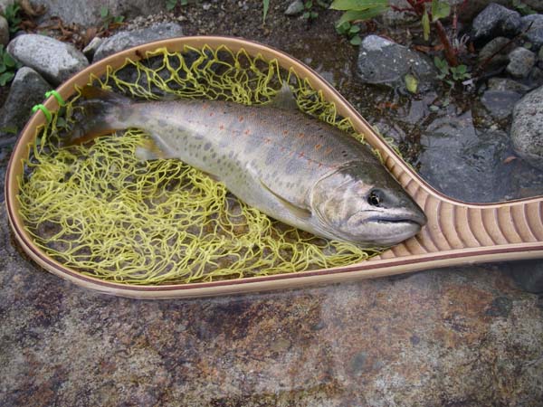 | フィッシャー:竹内靖善様 日時:2006/06/20 場所:庄川支流 魚種とサイズ:イワナ36cm アタリフライ:#12ピーコックパラシュート 店主コメント:尺イワナおめでとう!36cmは立派です、パチパチ!!! |