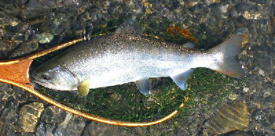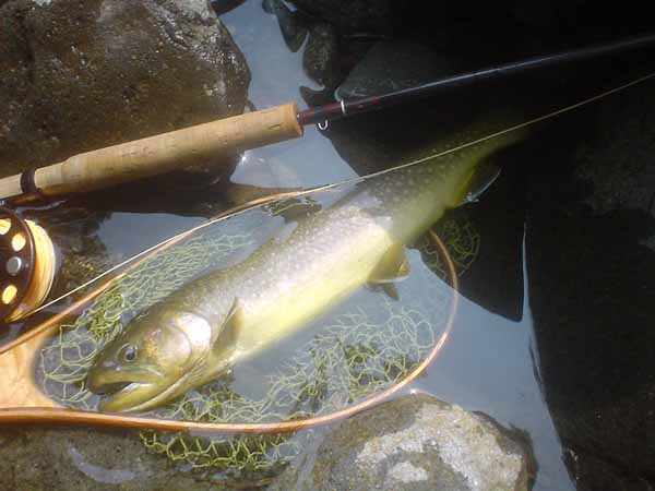 | フィッシャー:長野のY様 日時:2006/07/08 場所:高原川 魚種とサイズ:イワナ33cm アタリフライ:#18オリジナルブユフライ 店主コメント:尺イワナおめでとう!本流の魚は強かったでしょ、良かったね。 |