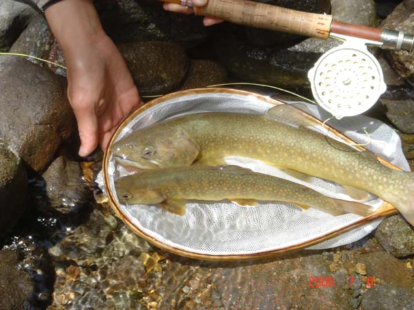 | フィッシャー:石原和幸様 日時:2006/07/22 場所:宮川水系 魚種とサイズ:イワナ34、33cm アタリフライ:#16オリジナルパラシュート 店主コメント:今期2回目登場、本当におめでとう! |