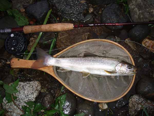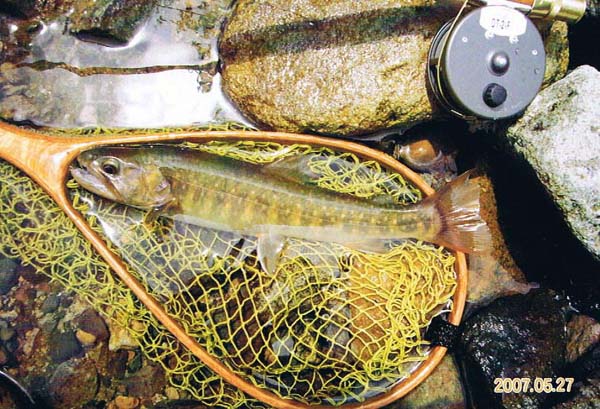 | フィッシャー:南谷隆次様 日時:2007/06/14 場所:高原川本流 魚種とサイズ:イワナ30cm アタリフライ:#12エルクヘアカディス 店主コメント:今期2本目ゲットおめでとう! |
