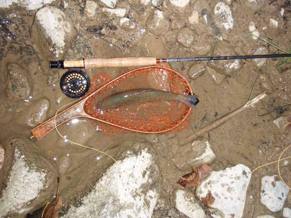 薄暗くなってから待望のライズが出て、豊場さんが尺イワナゲット、→