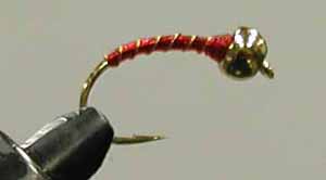 #10サイズのフックに巻いた、ぎょっとするほどデカイ赤のピューパ、